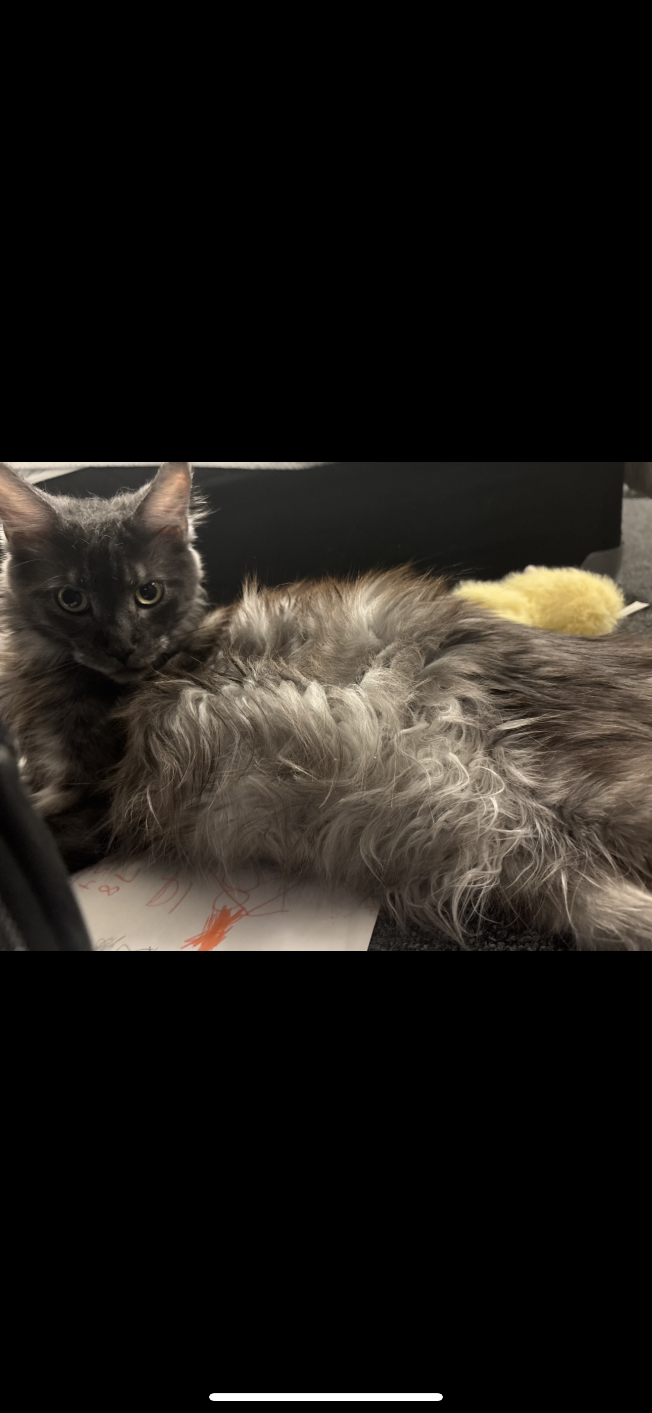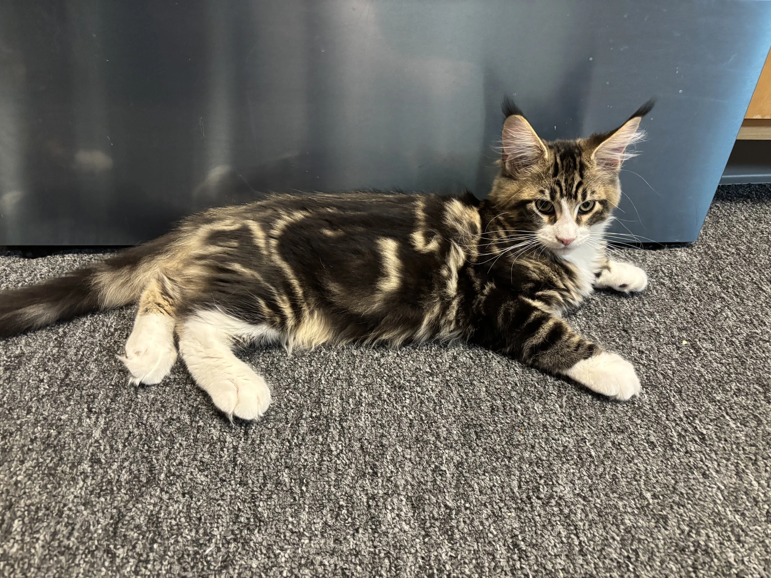 She is a beautifully composed Maine Coon with a quiet, observant personality. She is naturally independent and appreciates having her own space, choosing affection on her own terms rather than seeking constant attention. While she prefers a calm environment and enjoys being left alone, Ember has a gentle fondness for children and can often be found nearby watching them play.